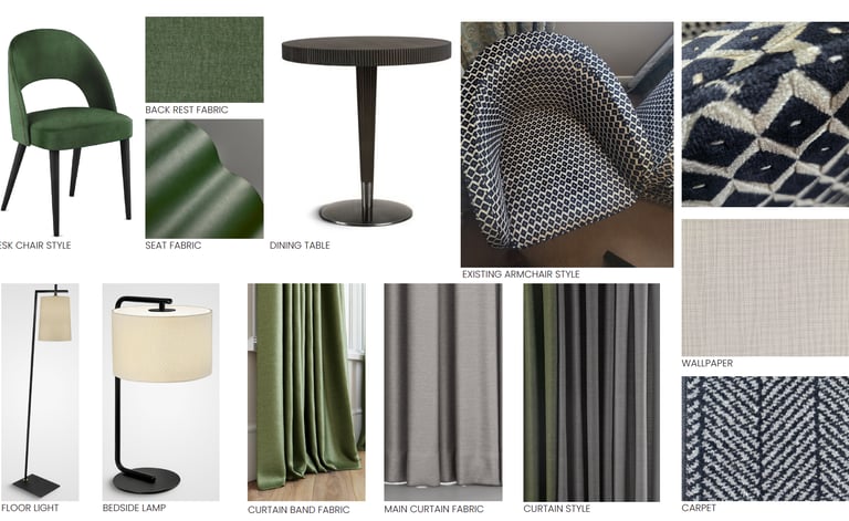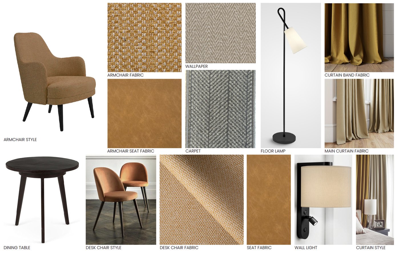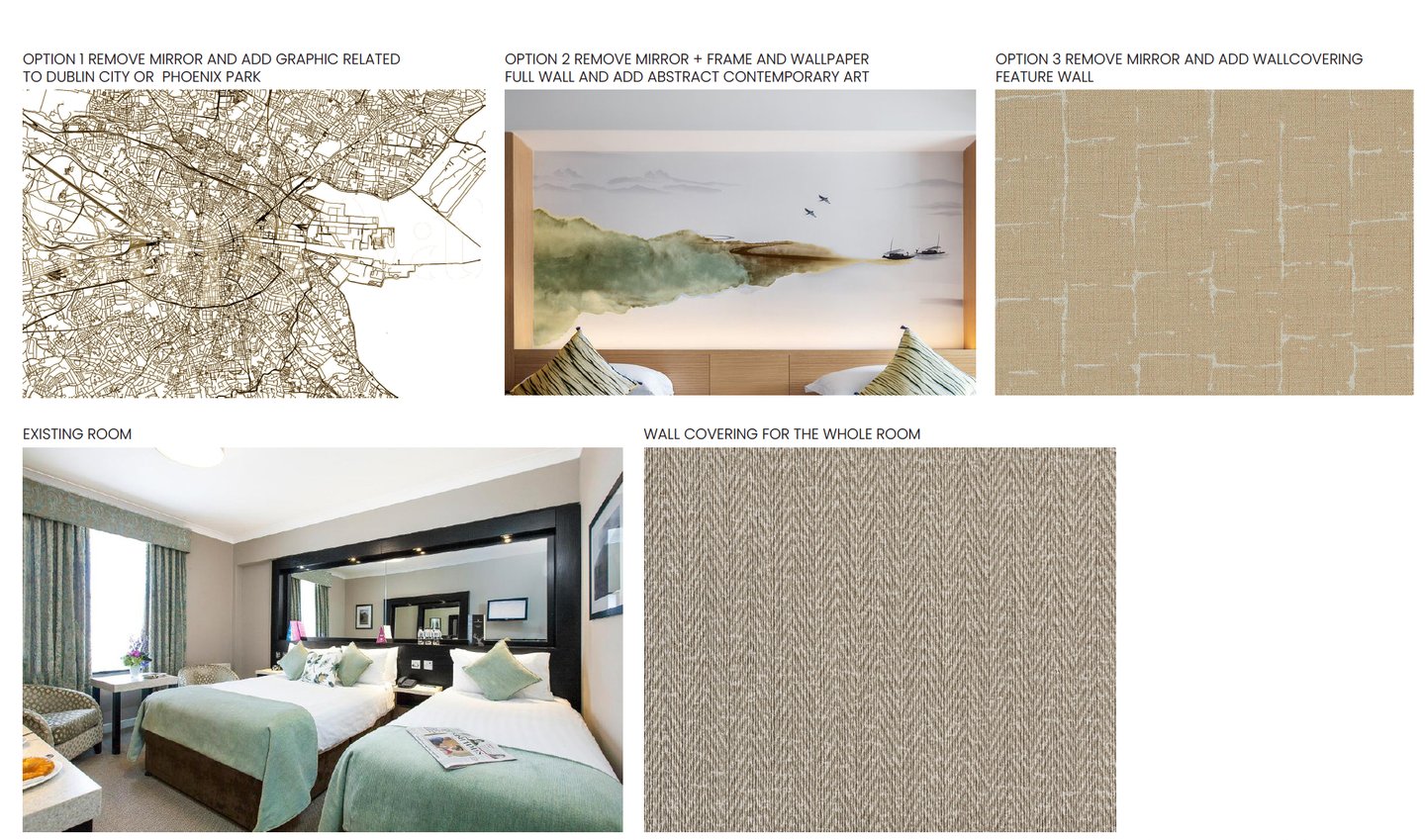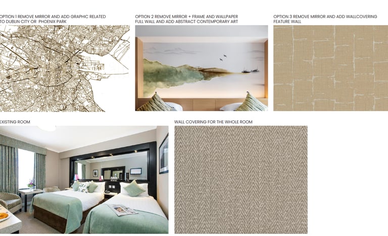 4-Star Hotel project located in Dublin, Ireland. For this project the brief was to present 3 bedroom soft furnishing schemes and 2 ensuite schemes, keeping existing joinery and proposing new budget-friendly changes. For the first scheme we chose green fabrics and incorporated the existing armchair. The second scheme was teal with natural leathers and silky curtain fabrics. Third was the gold scheme with herringbone wallcovering.