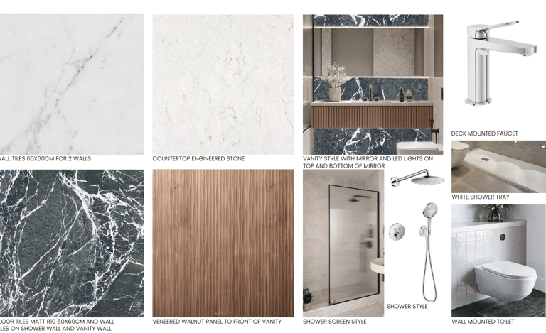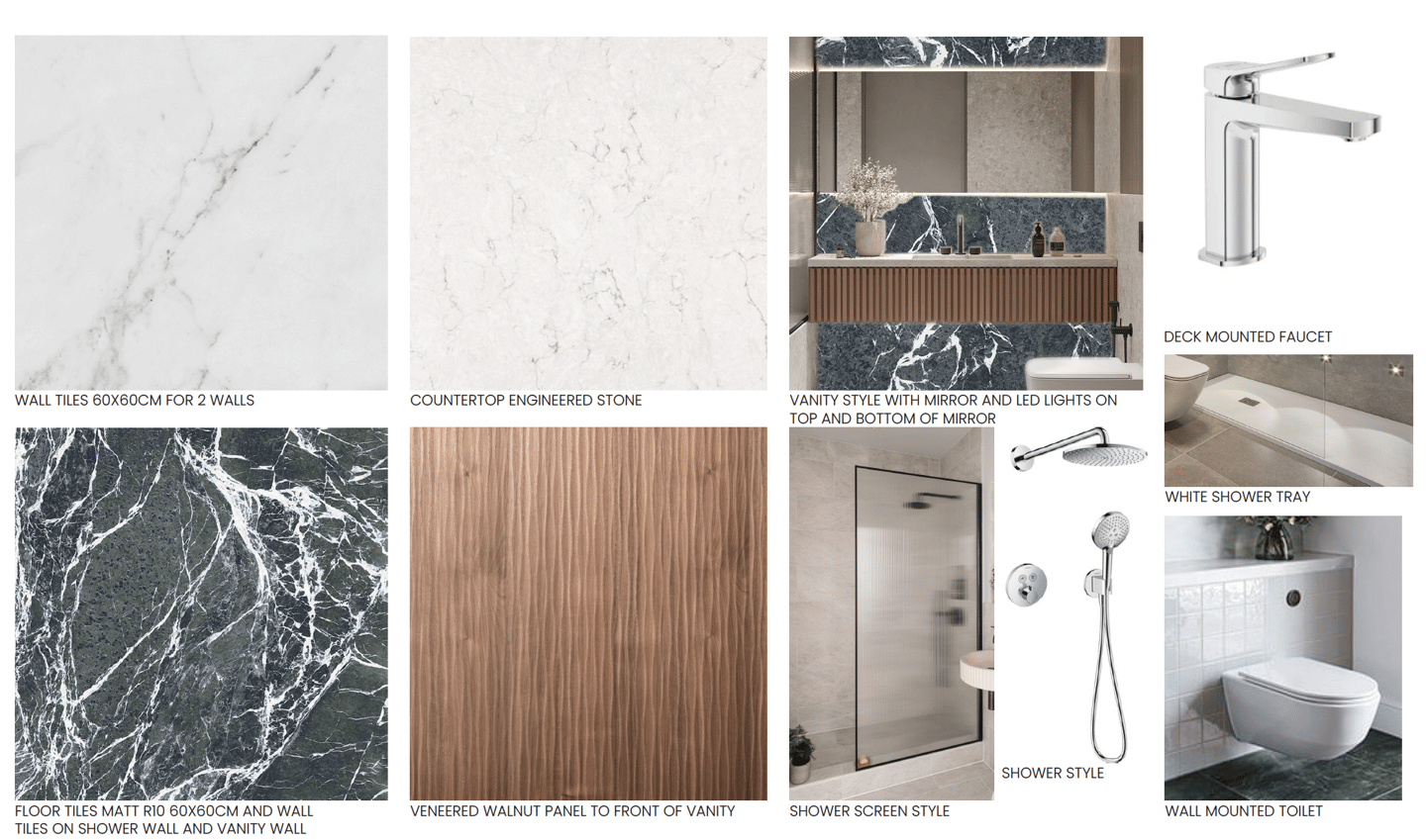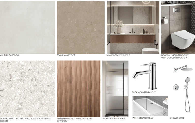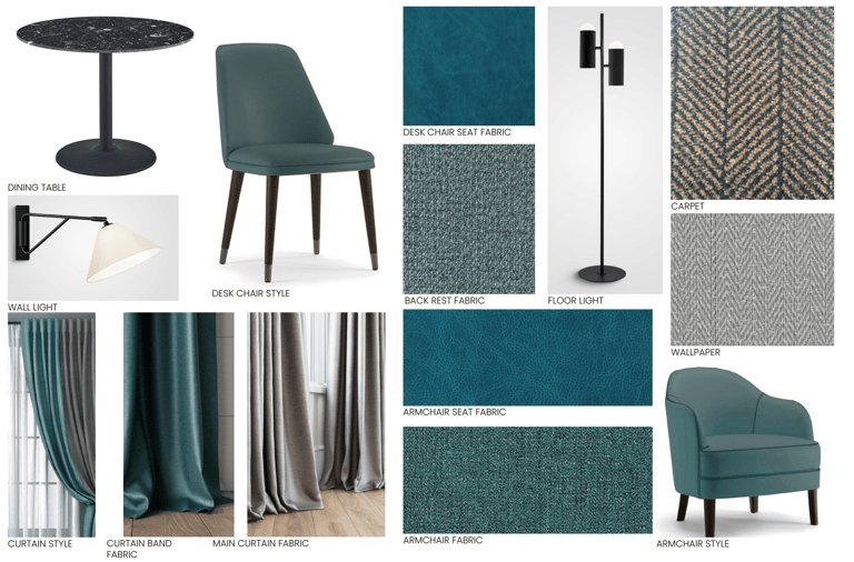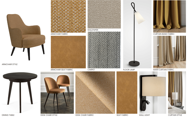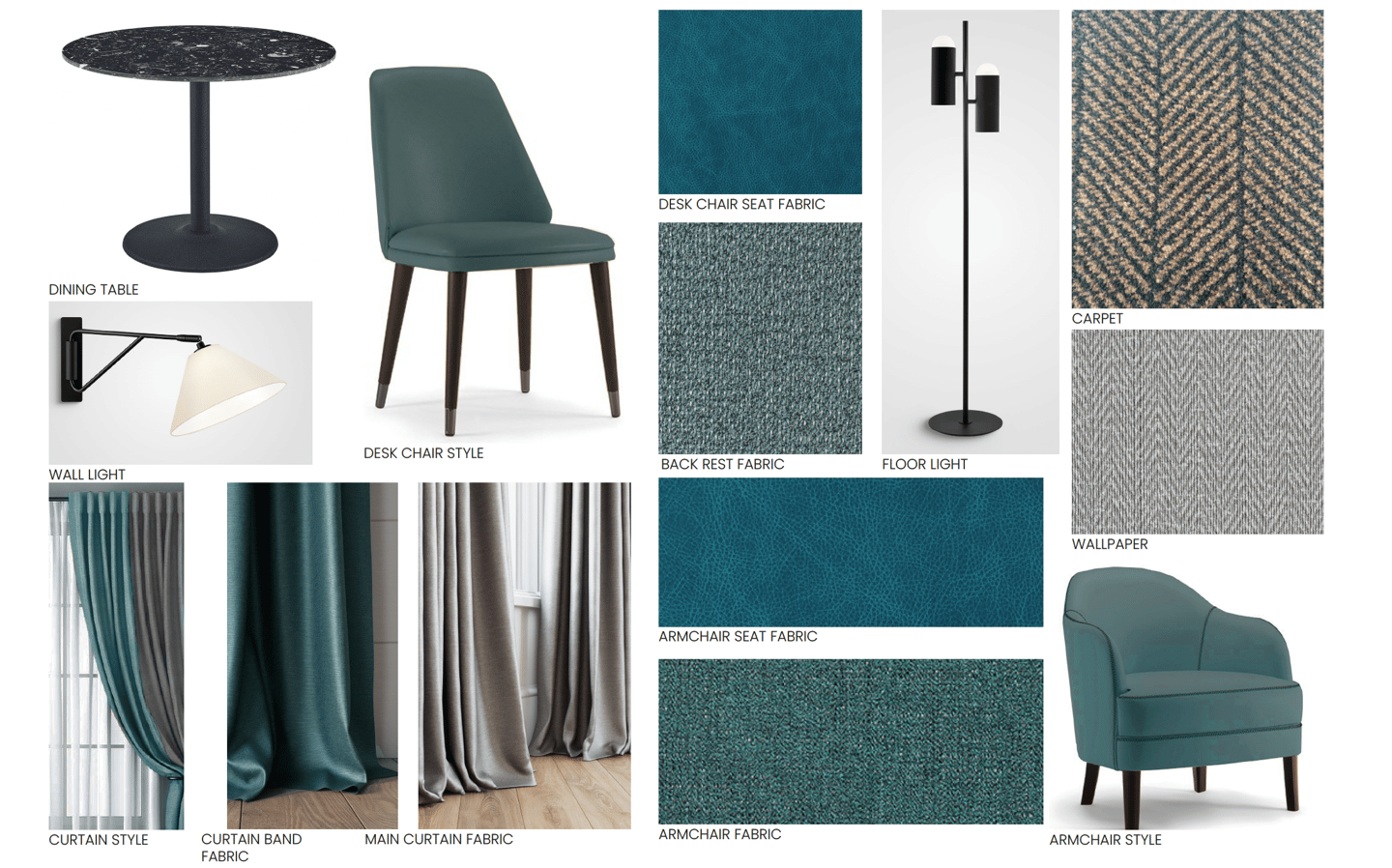 4-Star Hotel project located in Dublin, Ireland. For this project the brief was to present 3 bedroom soft furnishing schemes and 2 ensuite schemes, keeping existing joinery and proposing new budget-friendly changes. For the first scheme we chose green fabrics and incorporated the existing armchair. The second scheme was teal with natural leathers and silky curtain fabrics. Third was the gold scheme with herringbone wallcovering.