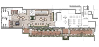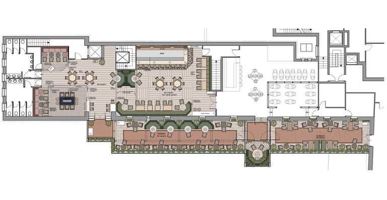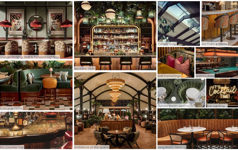 Two-storey bar design with outdoor terrace on both levels located near Dublin, Ireland. Downstairs on the ground floor will be more of a gentleman's bar atmosphere, and upstairs will be a cosy cocktails bar for lady's night out with patterned fabrics and cosy furnishings.