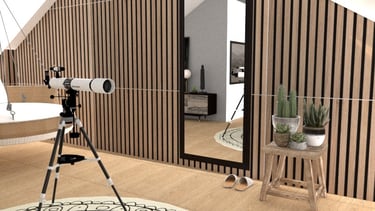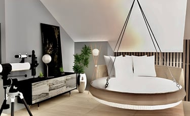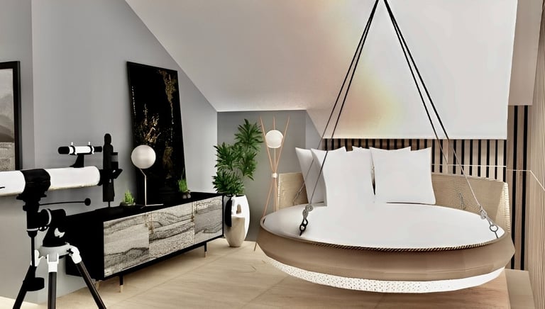 Attic room design with swing day bed and telescope to watch stars at night